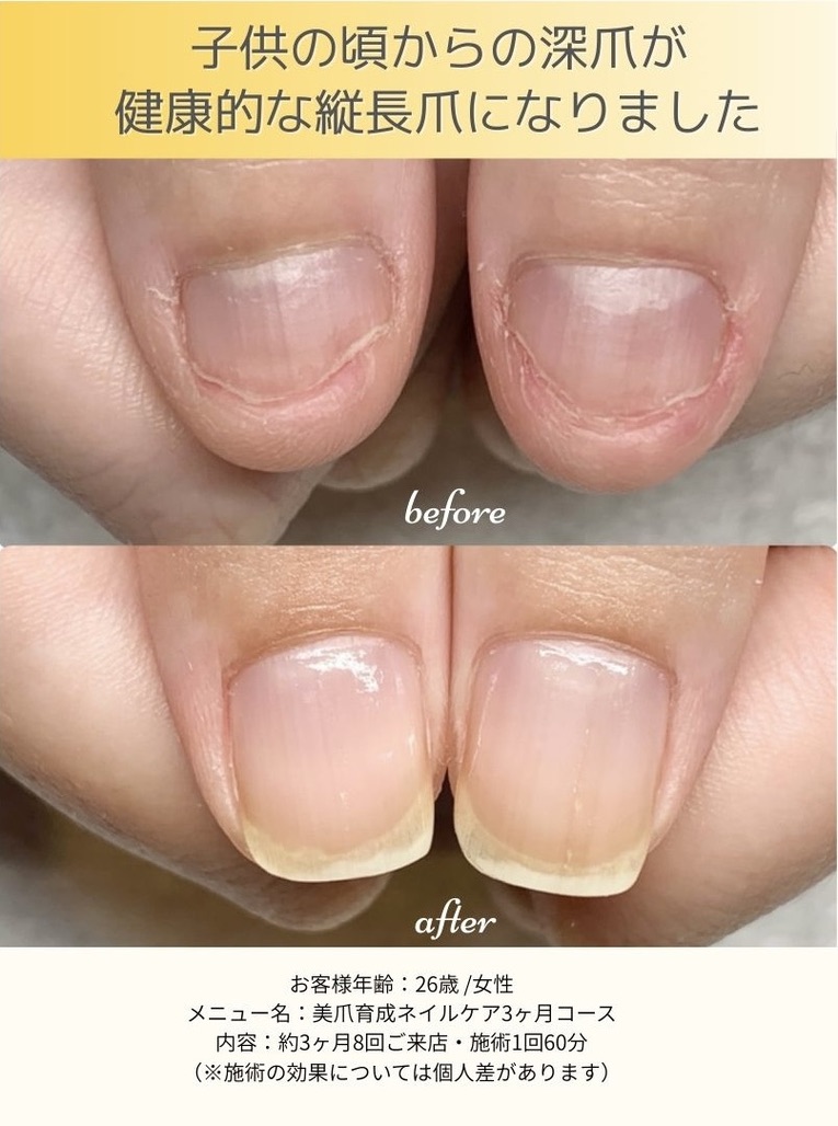 当サロンは、20代〜80代と幅広いお客様にご来店いただいています。 - Qどのくらいで縦爪になりますか?