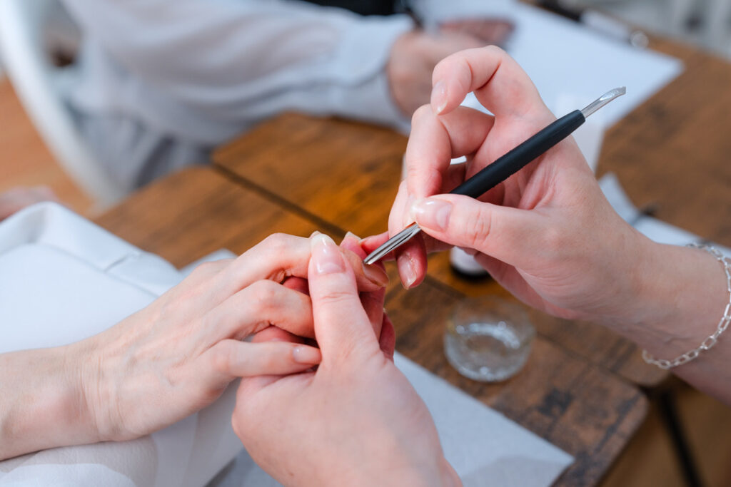 丁寧にケアをしていきます。当サロンは、どのコースもウォーターケア(指先をお湯に浸け柔らかくしてからニッパーでの甘皮処理)を行います。