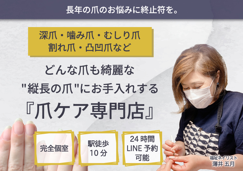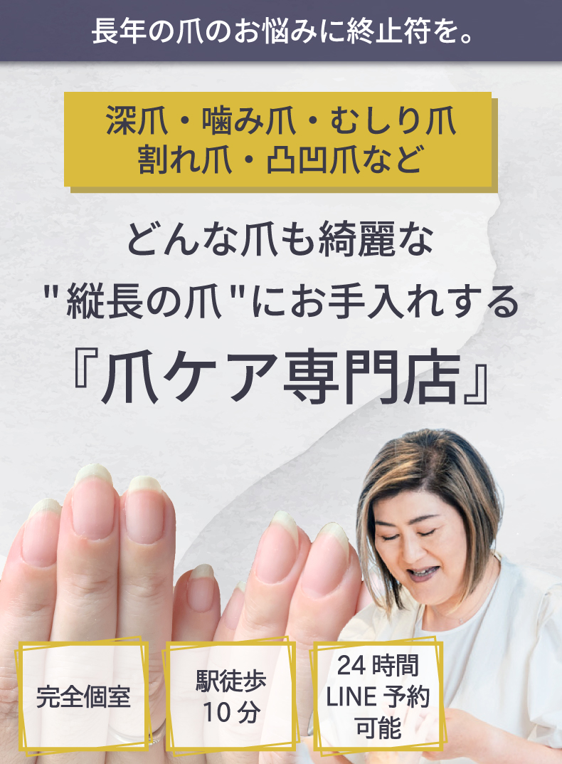 当サロンは、20代〜80代と幅広いお客様にご来店いただいています。 - Qどのくらいで縦爪になりますか?